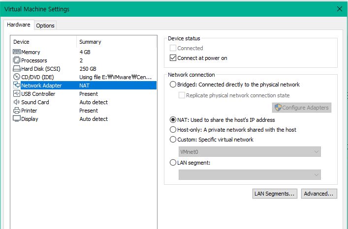 VM에서 사용할 네트워크 카드를 설정한다. 여기서는 기본으로 제공하는 NAT 이더넷을 사용하여 연결할 예정. 위의 네트워크 에디터에서 보이듯 vmplayer를 설치하면 1번, 8번 VM network가 생기는데 1번은 VM간 내부 통신용이고 8번이 host와 통신하는 NAT 이더넷이다.
