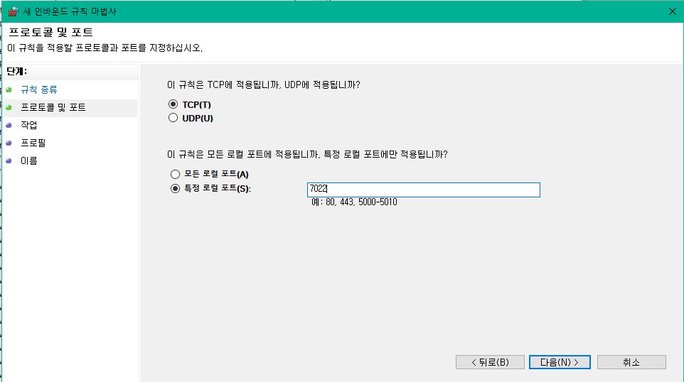 포트 선택 -> 특정 로컬 포트에 포워딩 할 포트를 입력 -> 연결 허용 -> 프로필 선택 -> 이름 정하고 완료